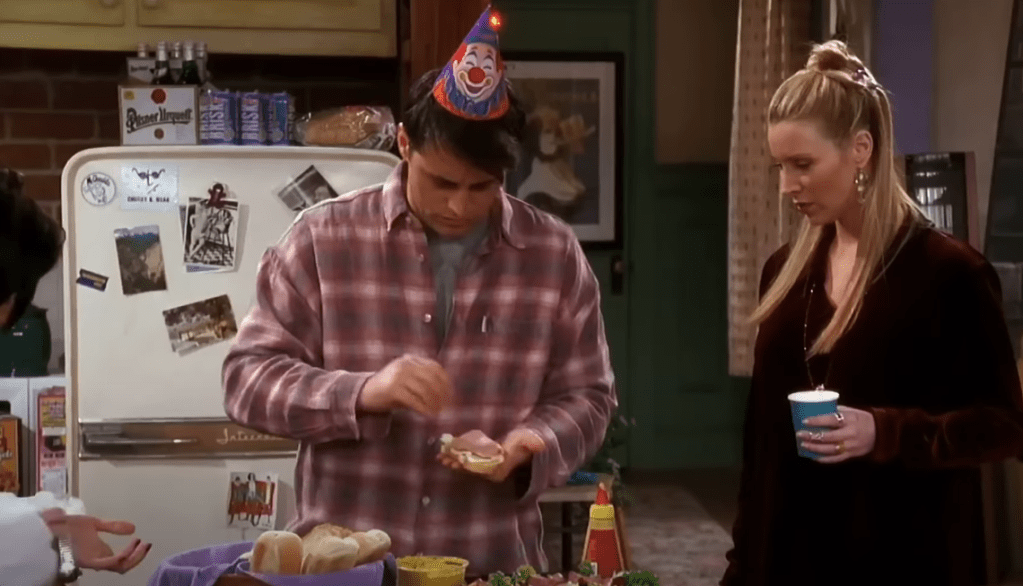 When Phoebe is pregnant and the babies are craving meat, Joey offers to not eat meat until they come so “she could eat his cows.” This is coming from someone who tried to save a sandwich from a bullet (car backfire), food means a lot to Joey, it may be his language of love and if so, the only person he wishes to share and help seems to be Phoebe.